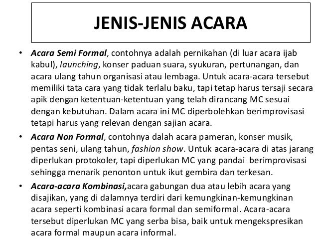 Contoh dari salam pembuka yaitu. Sang MC bisa memperbaikinya jadi. Acara Non Formal contohnya dalah acara pameran konser musik pentas seni ulang tahun fashion show.