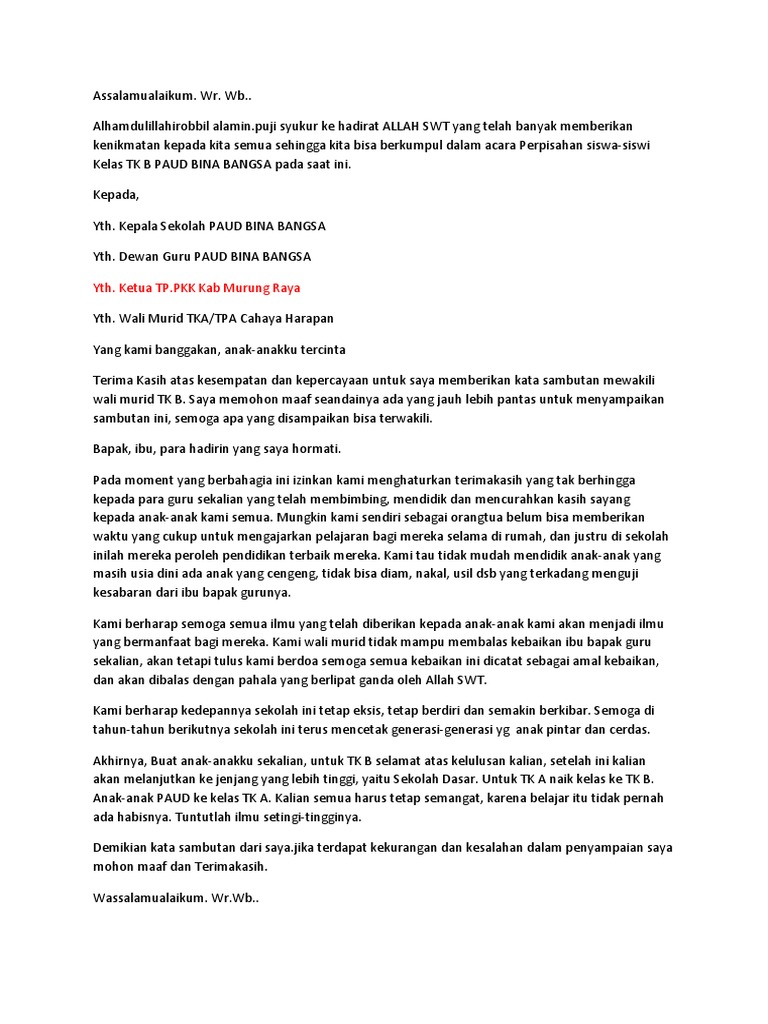 Contoh Sambutan Wali Murid Tk Paud Acara Perpisahan Administrasi Tk Paud