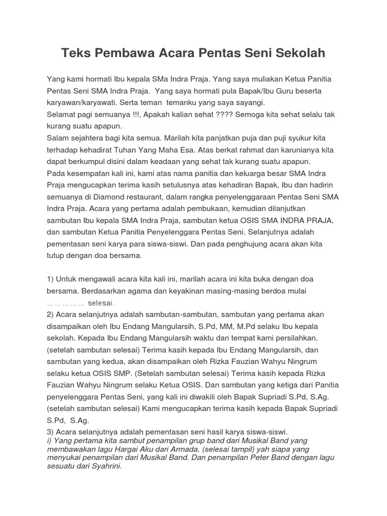 21 contoh teks pidato singkat dan menarik dalam berbagai tema beranda pendidikan 17 contoh teks mc formal dan non formal dalam berbagai acara tinggalkan komentar batalkan balasan. Mc acara pensi. Indonesia ini siapa tau nanti ada yang membuntuhkan tugas ini naskah mc ini 100 naskah buatanku sendiri.