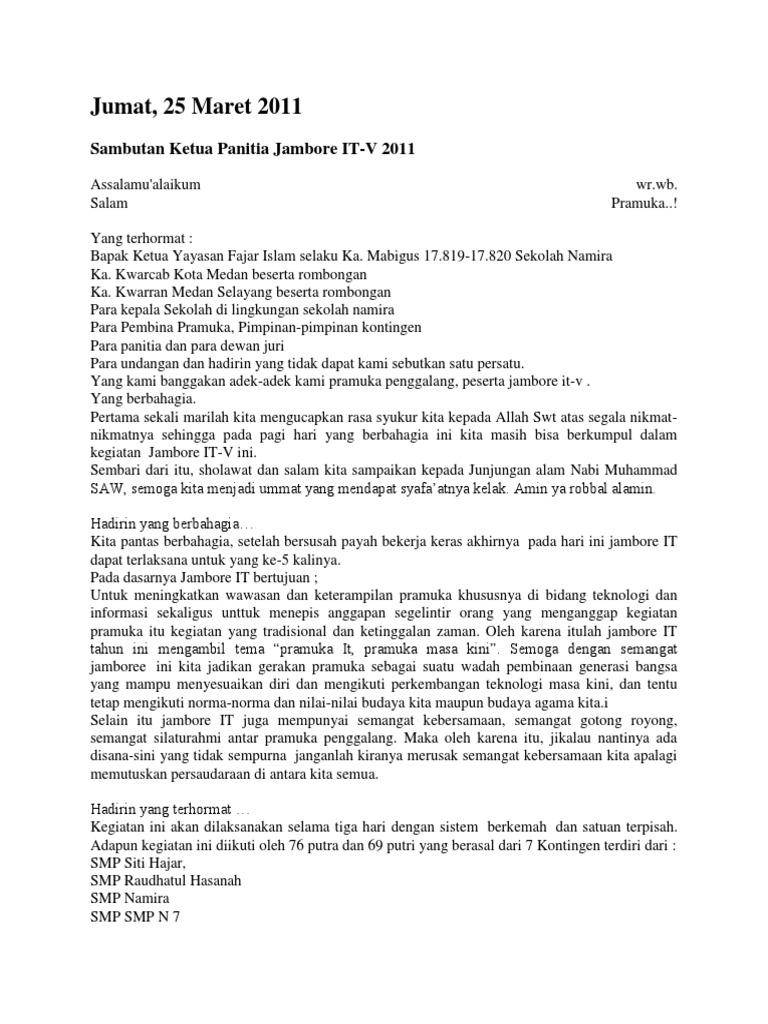 Pendahuluan Bahwa Gerakan Kepanduan Nasional yang lahir dan mengakar di bumi Nusantara merupakan bagian terpadu dari gerakan perjuangan kemerdekaan Indonesia yang membentuk Negara Kesatuan Republik. Contoh Kata Sambutan Ketua Panitia Peringatan Hari Besar Islam Assalamualaikum warohmatullahi wabarokatuh. Yang terhormat Para Ketua Mabida dan Mabicab Gerakan Pramuka.