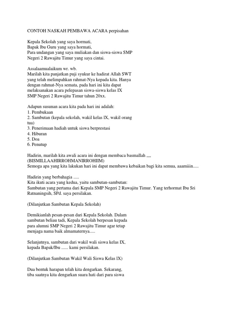 Pada acara perpisahan tidak mungkin terlepas dari yang namanya pidato mulai dari pidato penyambutan pidato perwakilan kelas hingga pidato penutupan. Penutupan doa TEKS PEMBAWA ACARA PADA ACARA RESEPSI AQIQAH Hadirin yang di muliakan Alloh. إ ن ال ح م د ل ل ه ن ح م د ه و ن س ت ع ي ن ه و ن س ت غ ف ر ه و ن س ت ه د ي ه و ن ع وذ ب الله م ن ش ر و ر أ ن ف س ن ا و م ن س ي ئ.