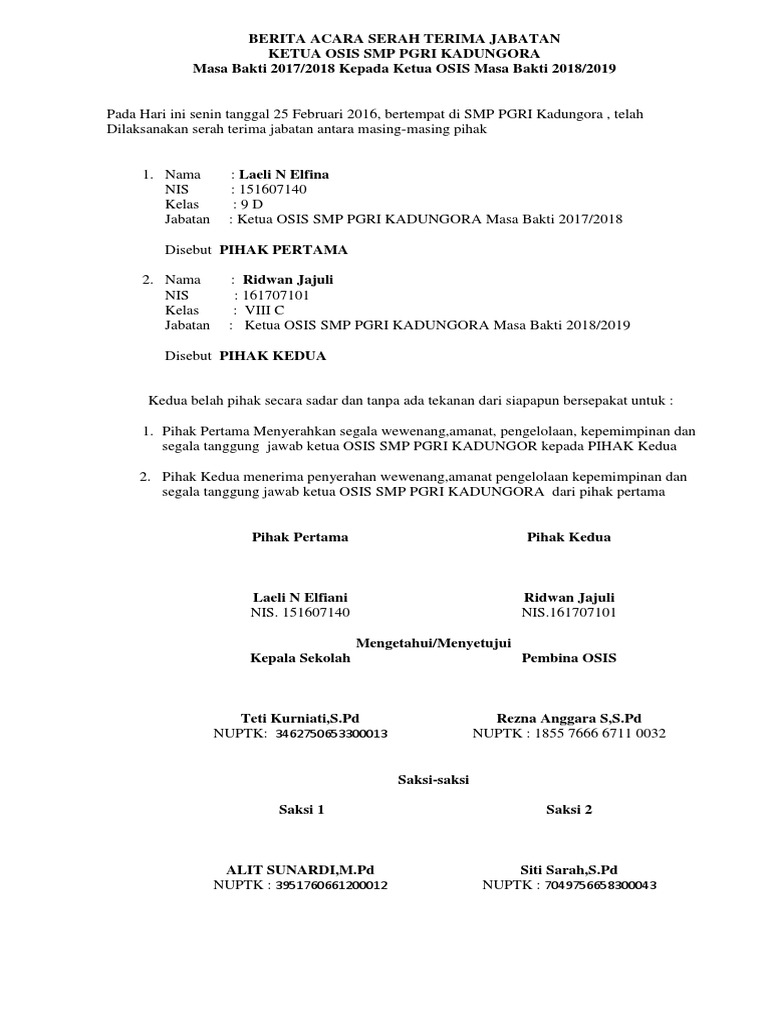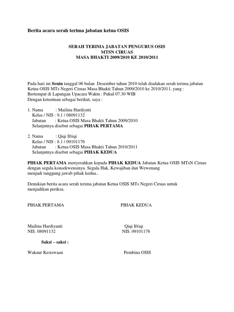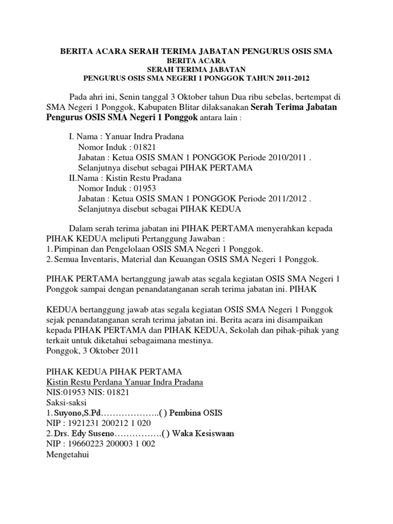Berita Acara Serah Terima Jabatan Pengurus Osis Sma. - yang saya hormati bapak kepala SMP. Saturday 20 Feb 2021 - Kategori.