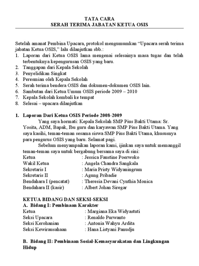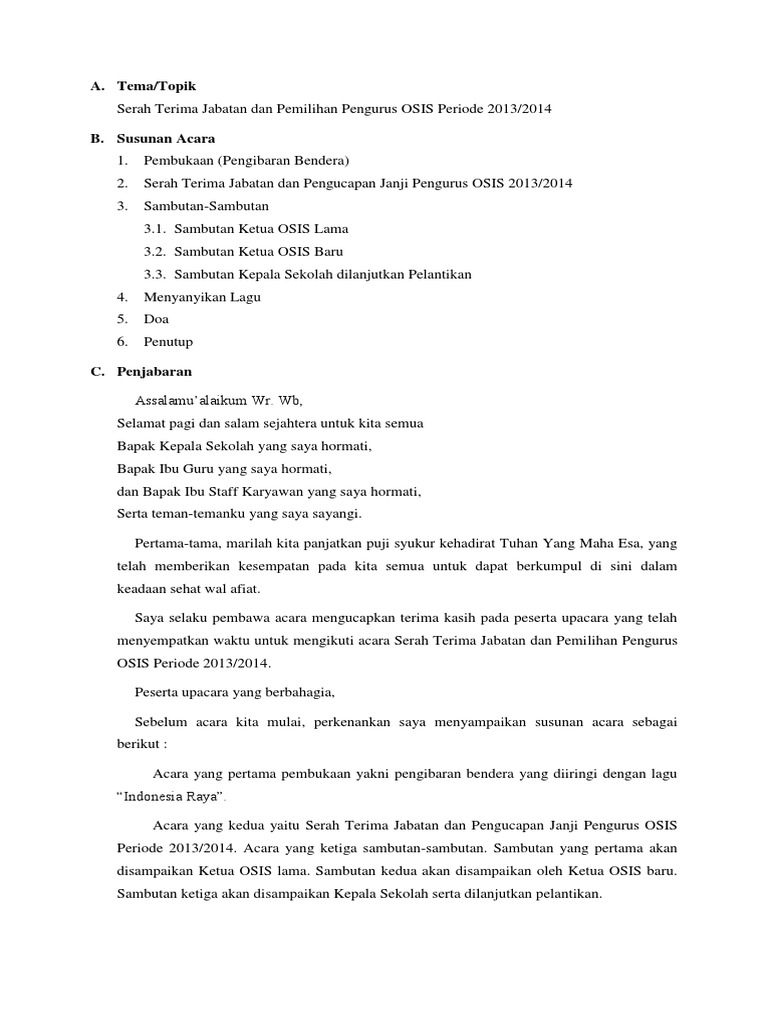 Contoh Susunan Acara Pelantikan Osis Terbaru Penulis Cilik Contoh Teks Pembawa Acara Perpisahan Teks Pidato Pengurus Osis Baru Docx Document Contoh Kata Sambutan Serah Terima Jabatan Kepala Sekolah Contoh Kata Sambutan Acara Pelantikan Susunan Debat Calon Ketua Dan Wakil Osis Pelantikan Pengurus Osis Smk N 1 Portibi Periode 2015. Contoh Pidato Sambutan Serah Terima Jabatan. BERITA ACARA SERAH TERIMA JABATAN PENGURUS OSIS SMP NEGERI 4 BANJARNEGARA MASA BAKTI 20142015 Yang bertanda tangan dibawah ini masing-masing.