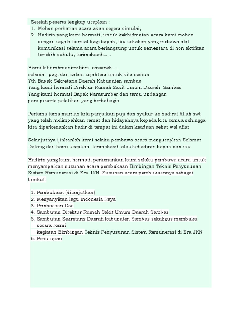 Teks pembawa acara MC sebenarnya bersifat fleksibel poin - poin yang kurang atau lebih bisa disesuaikan. Yang terhormat. Nantinya kata sambutan disesuaikan dengan acara sehingga pantas untuk disampaikan.