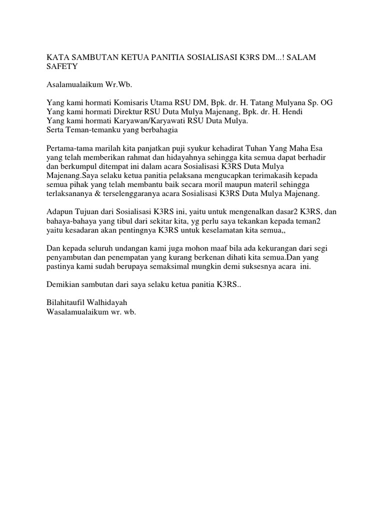 Pada saat ini Anda dapat mencari contoh kata sambutan panitia sebagai referensi. Contoh Kata Sambutan Ketua Panitia Peringatan Hari Besar Islam Assalamualaikum warohmatullahi wabarokatuh. Terakhir saya memohon maaf yang sebesar-besarnya apabila terdapat kesalahan-kesalahan.