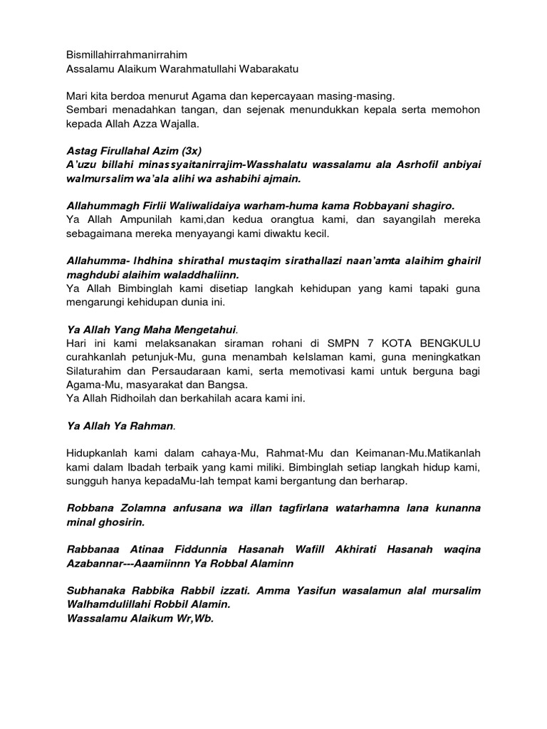Hal tersebut bertujuan agar acara nantinya bisa berjalan lancar atas izin Allah SWT. Doa Penutup Seminar. Sebagai contoh susunan acara untuk majelis taklim keagamaan atau acara resmi dapat digunakan susunan berikut.