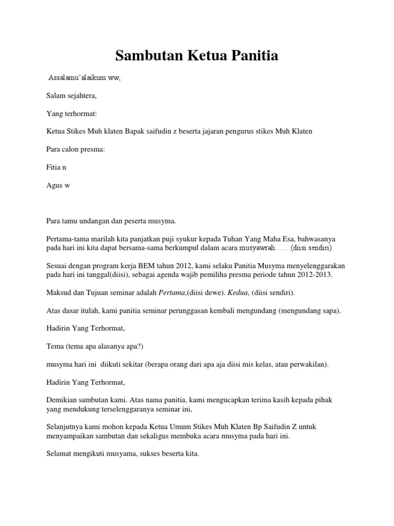 Contoh Sambutan Ketua Panitia Bahasa Inggris Terbaik Kumpulan Referensi Teks Pidato. Contoh PIDATO Sambutan Ketua Panitia Seminar 2. Jika disekolah ada saatnya kita berpisah de.
