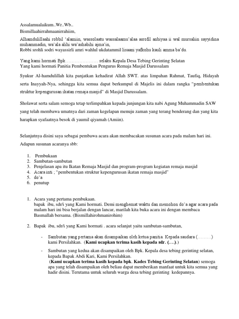 Pengurus Takmir Masjid adalah sekelompok orang yang dipilih melalui musyawarah dan mufakat yang bertanggung jawab memakmurkan masjid. Contoh Teks Pembawa Acara Rapat Omndo Com. Contoh teks MC halal bihalal bahasa Jawa singkat.